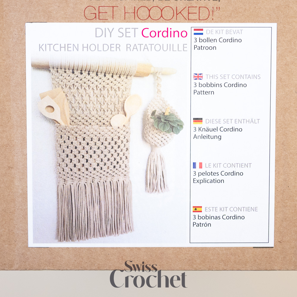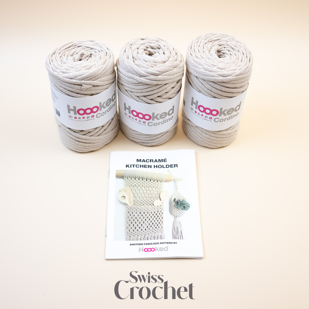 Mit diesem Makramee-Küchenhalter-Projekt gestaltest du eine schöne Wanddekoration, die sowohl funktional als auch dekorativ ist. Genau das hatte Designerin Mirjana im Sinn, als sie dieses Stück entworfen hat. Durch die Kombination sorgfältig ausgewählter Makramee-Knoten mit dem robusten Hoooked Cordino Garn bietet das Design hervorragende Stabilität und Langlebigkeit.