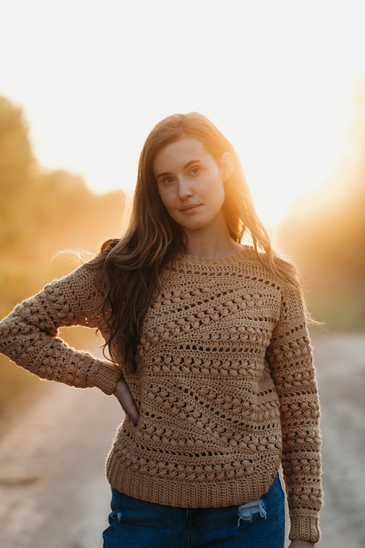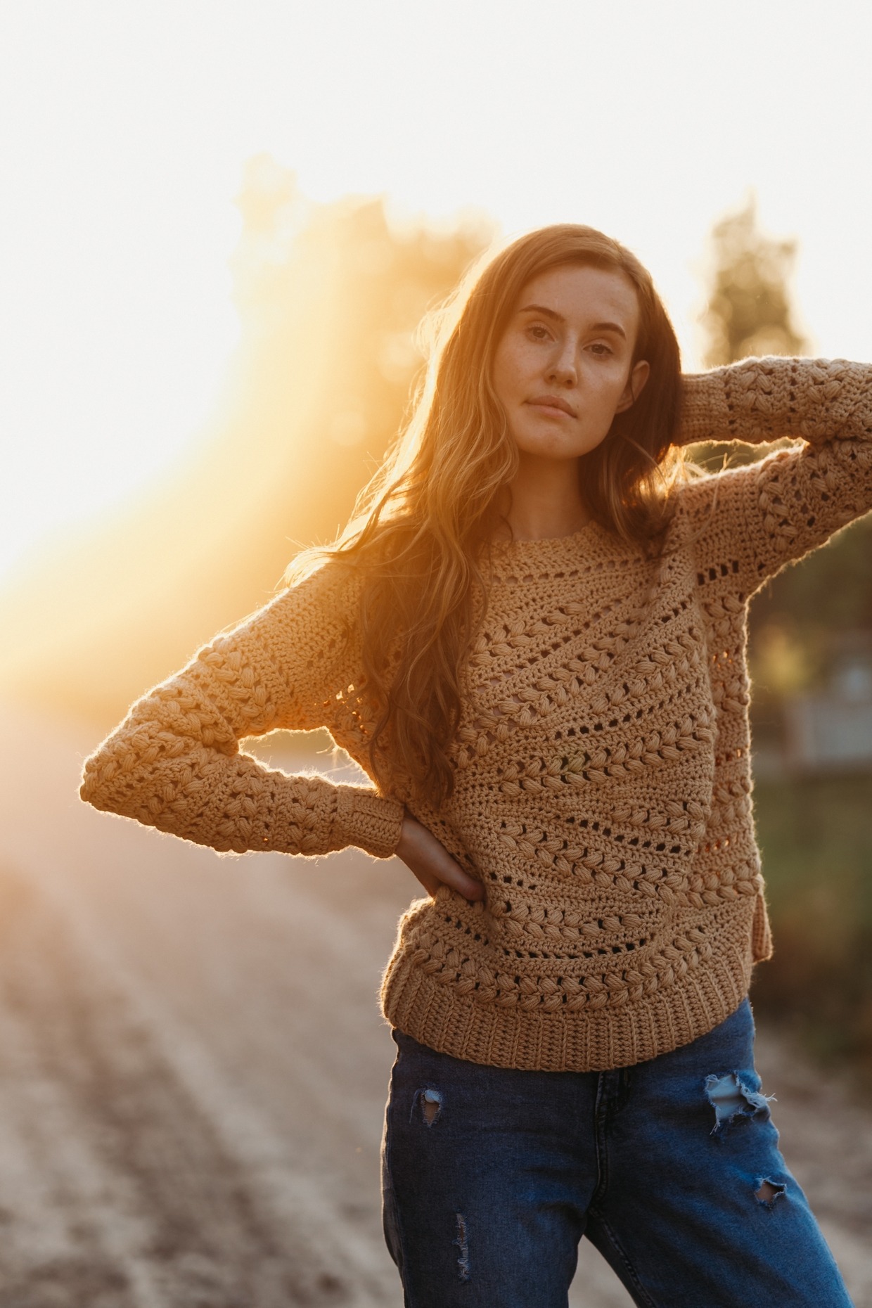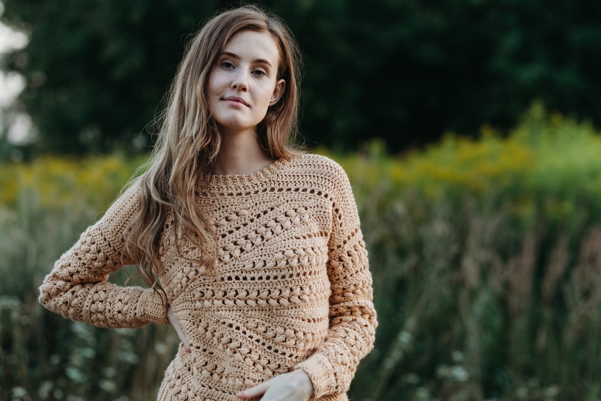 The Sensit Sweater is a textured straight boxy style sweater with fitted sleeves. It features puff stitches and short rows.