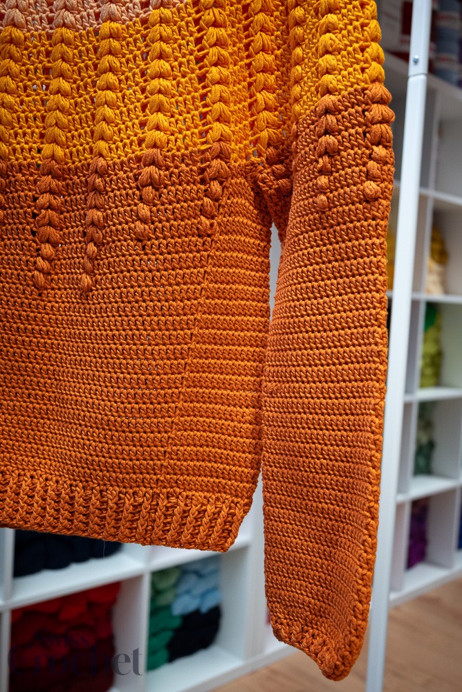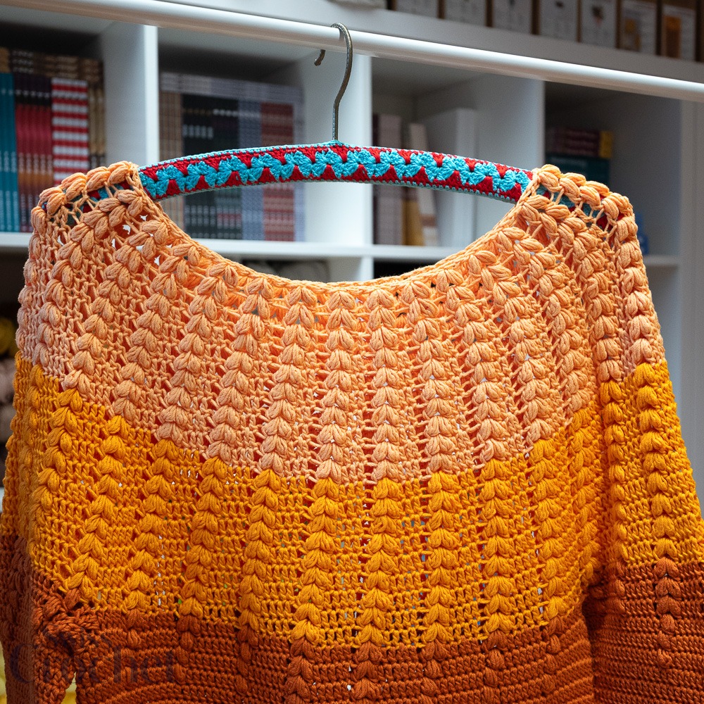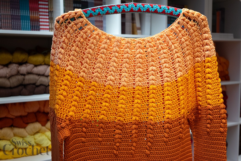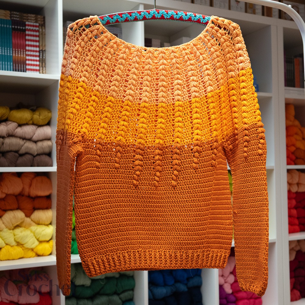 L’échantillon présenté est réalisé en taille 2 et utilise environ 690 g de fil (6 pelotes de Super 10).