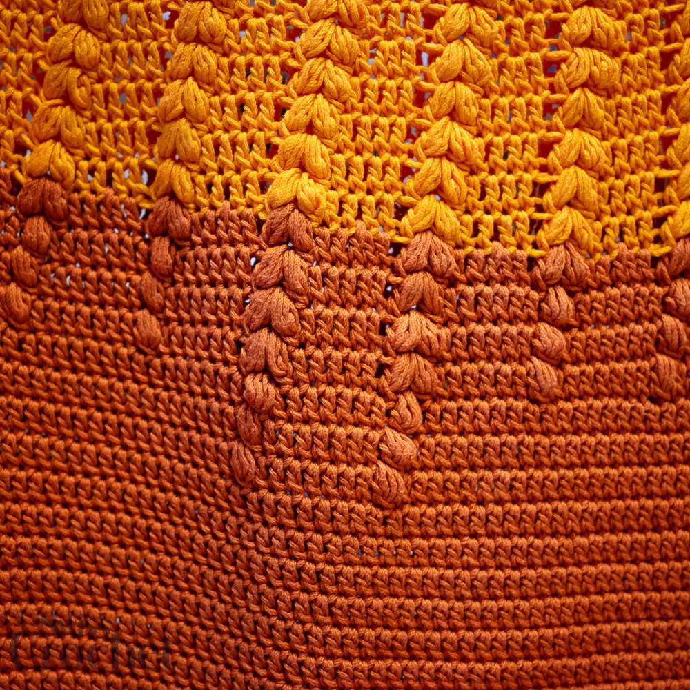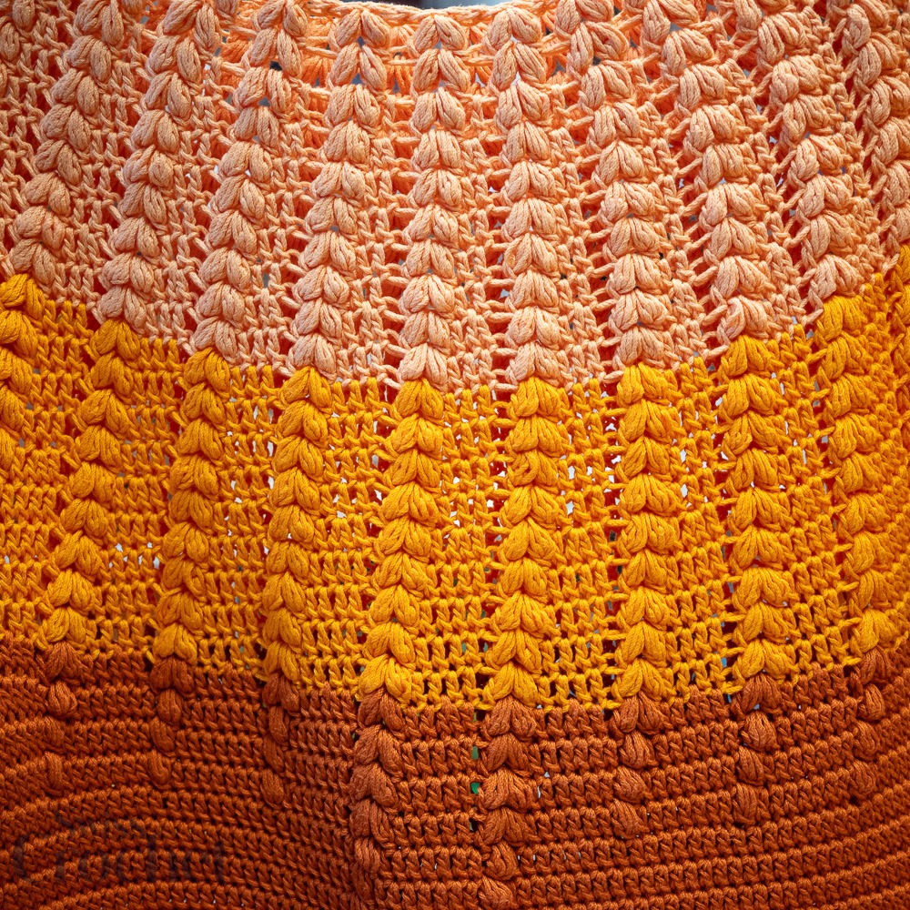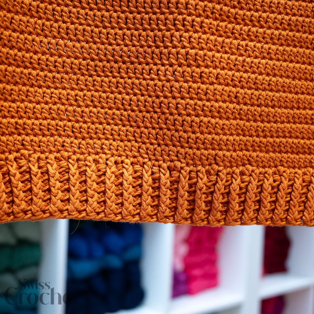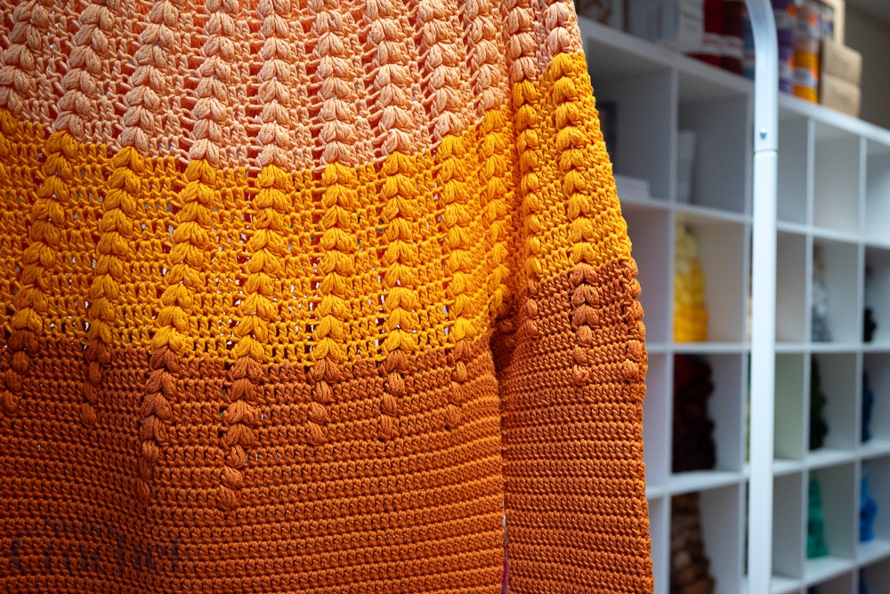 L’échantillon présenté est réalisé en taille 2 et utilise environ 690 g de fil (6 pelotes de Super 10).
