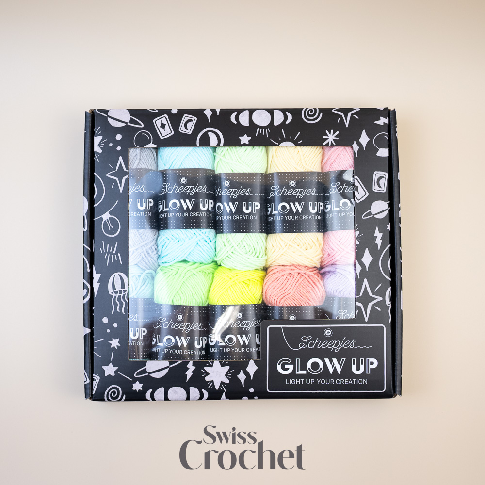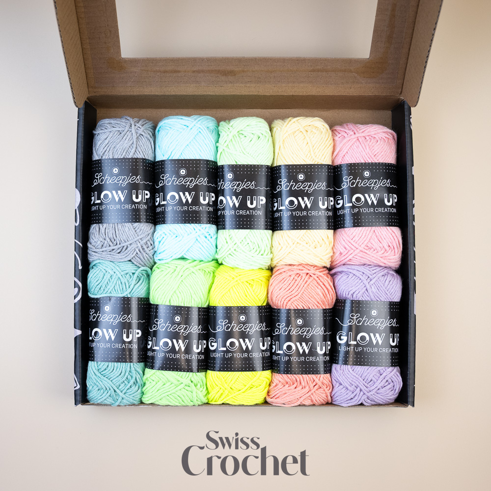 Ce coffret comprend 10 coloris de Scheepjes Glow Up en adorables mini pelotes de 25 g, offrant un total de 525 mètres de fil polyester, présentés dans une boîte luxueuse et facile à transporter.