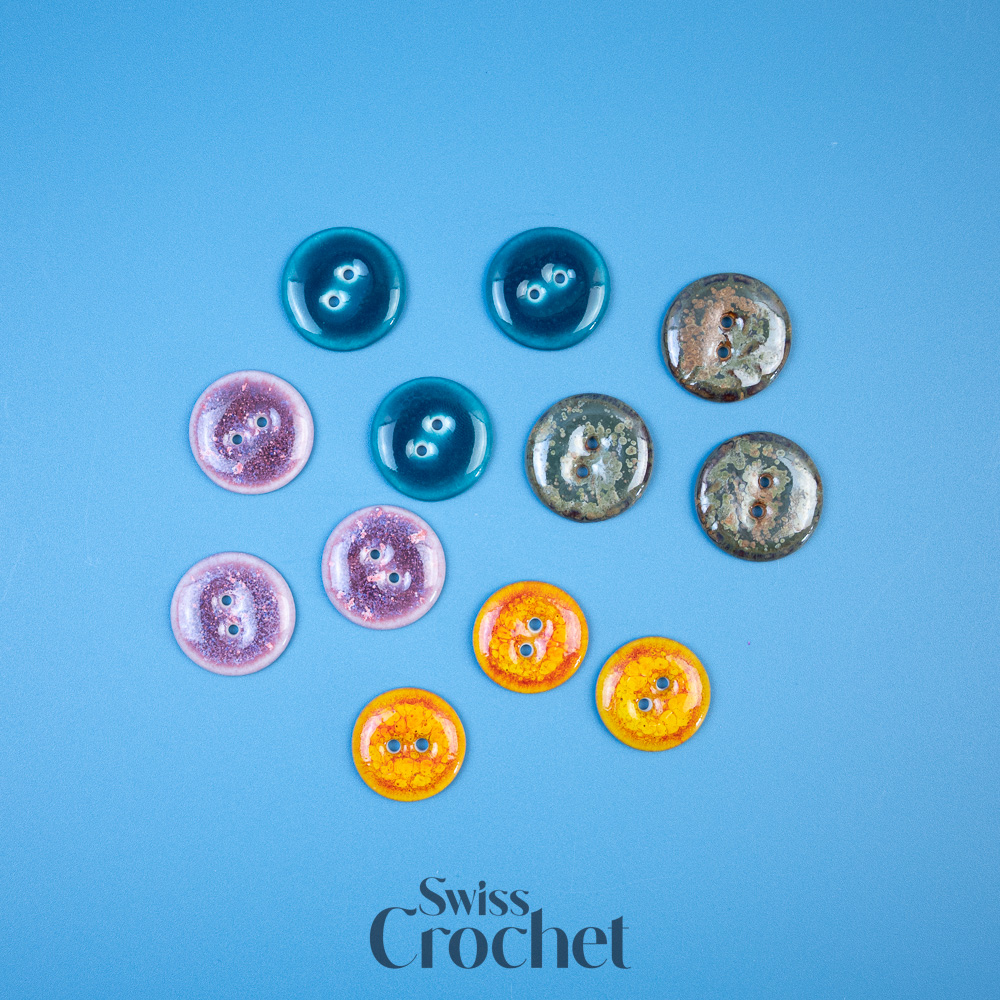 Fabriqués à la main par l’artiste céramiste Asya Franke (TodoBunto), ces boutons en céramique de 22/23 mm apportent un charme artisanal unique à tout projet au crochet. Chaque bouton est façonné et émaillé individuellement, lui donnant son propre caractère et de légères variations. Aucun bouton n’est absolument identique – de petites irrégularités dans la taille ou la forme font partie de leur beauté et témoignent d’un véritable travail fait main.