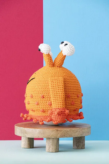 Meet Crackle, an expressive buddy for little monsters, who keeps all five of its eyes on everything occurring in your craft space! Crocheted in vivid orange shades of Scheepjes Catona—perfect for the spooky season – Crackle totters to life when placed over a softly tinkling wobble ball, adding an extra layer of fun to this quirky creation.