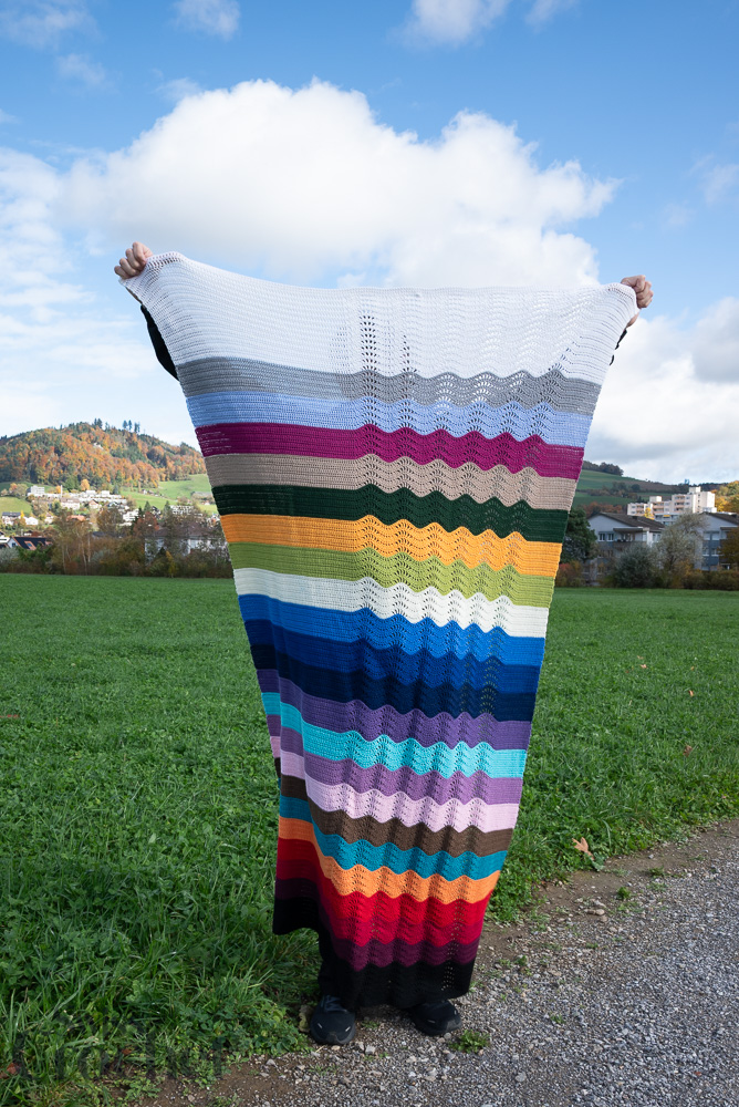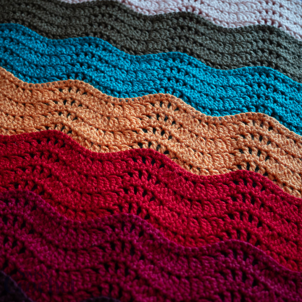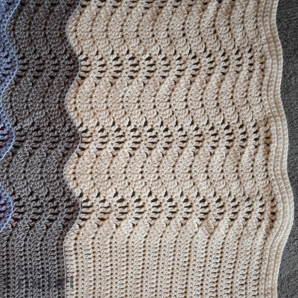 This design features gently undulating stripes that flow seamlessly across the blanket, creating a stunning visual texture reminiscent of ocean waves. The combination of stitches and colors gives this piece both movement and warmth — a perfect balance between relaxing crochet and striking results.