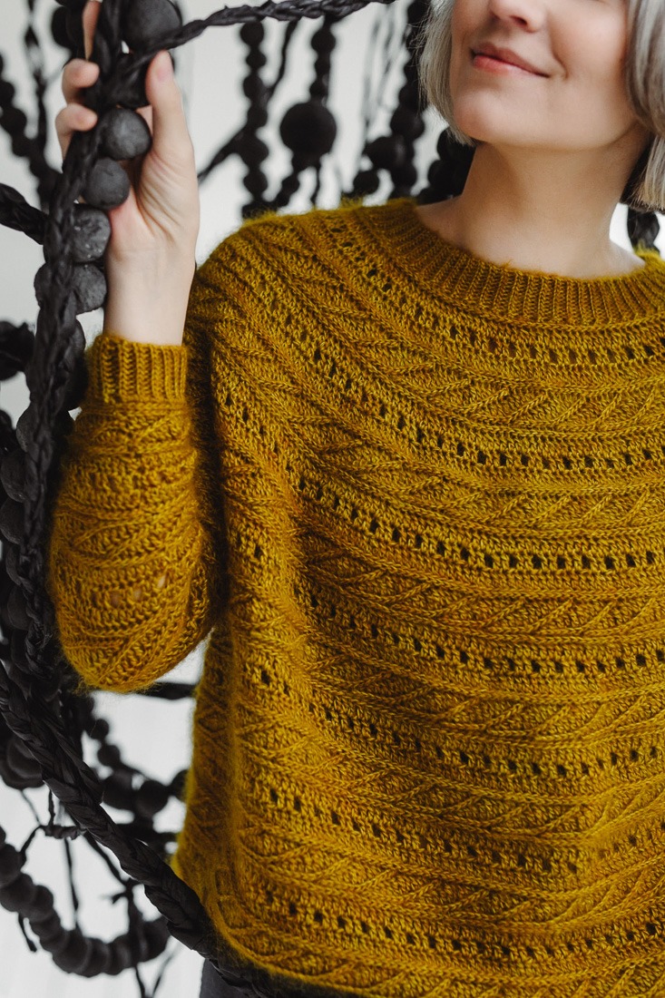 - 3 leaf repeats (18 sts) and 9 rows in 4’’ / 10 cm over the main stitch pattern with measurement beginning with the leaf motif rnd and using H / 5 mm hook, or hook size to obtain gauge.